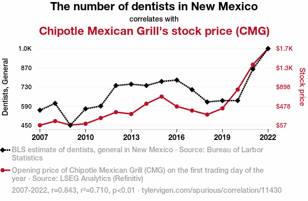 This means 71% of the change in the one variable (i.e., Chipotle Mexican Grill's stock price (CMG)) is predictable based on the change in the other (i.e., The number of dentists in New Mexico) over the 16 years from 2007 through 2022.