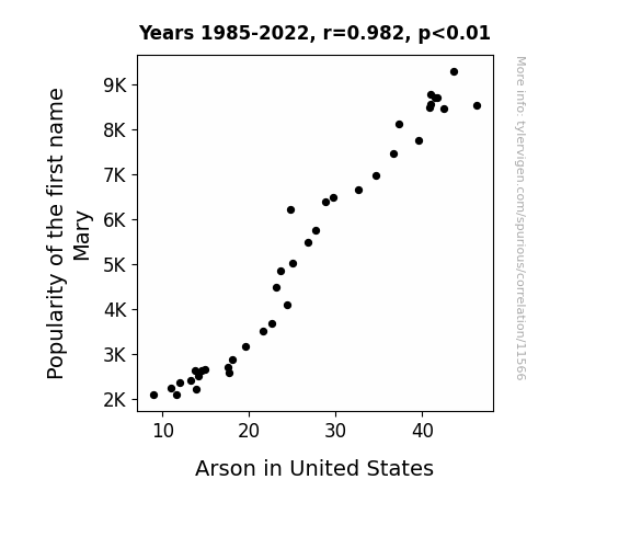 This means 96.5% of the change in the one variable (i.e., Arson in United States) is predictable based on the change in the other (i.e., Popularity of the first name Mary) over the 38 years from 1985 through 2022.