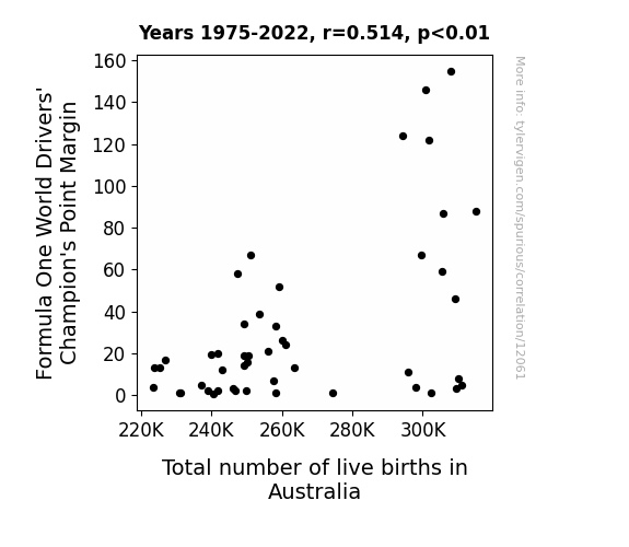 This means 26.4% of the change in the one variable (i.e., Total number of live births in Australia) is predictable based on the change in the other (i.e., Formula One World Drivers' Champion's Point Margin) over the 48 years from 1975 through 2022.