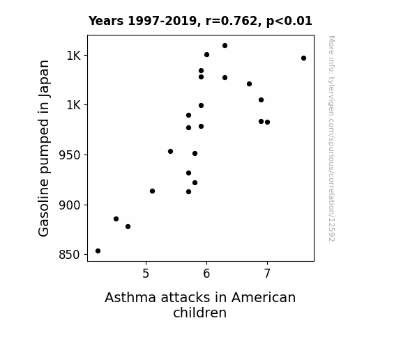 This means 58.1% of the change in the one variable (i.e., Asthma attacks in American children) is predictable based on the change in the other (i.e., Gasoline pumped in Japan) over the 23 years from 1997 through 2019.