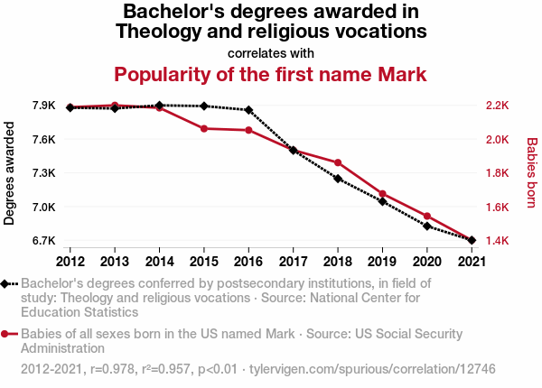 This means 95.7% of the change in the one variable (i.e., Popularity of the first name Mark) is predictable based on the change in the other (i.e., Bachelor's degrees awarded in Theology and religious vocations) over the 10 years from 2012 through 2021.