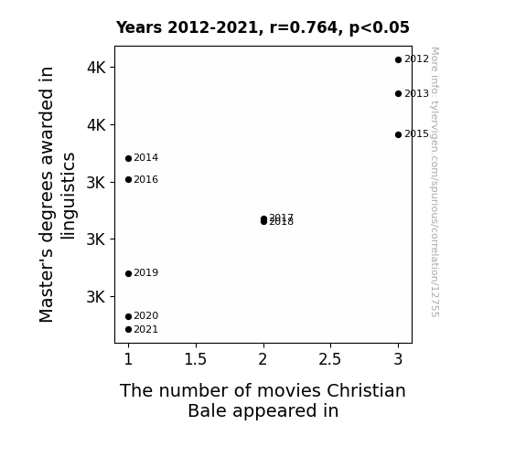 This means 58.3% of the change in the one variable (i.e., The number of movies Christian Bale appeared in) is predictable based on the change in the other (i.e., Master's degrees awarded in linguistics) over the 10 years from 2012 through 2021.