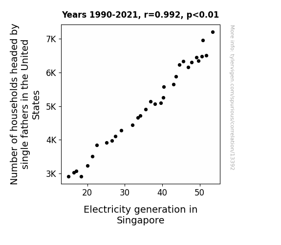 This means 98.3% of the change in the one variable (i.e., Electricity generation in Singapore) is predictable based on the change in the other (i.e., Number of households headed by single fathers in the United States) over the 32 years from 1990 through 2021.