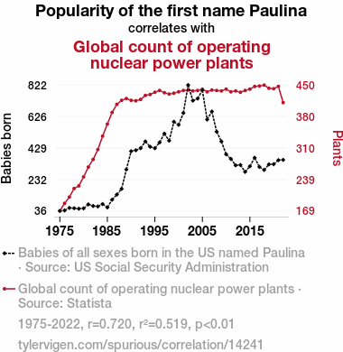 This means 51.9% of the change in the one variable (i.e., Global count of operating nuclear power plants) is predictable based on the change in the other (i.e., Popularity of the first name Paulina) over the 48 years from 1975 through 2022.