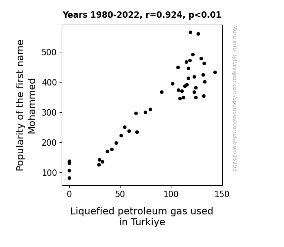This means 85.3% of the change in the one variable (i.e., Liquefied petroleum gas used in Turkiye) is predictable based on the change in the other (i.e., Popularity of the first name Mohammed) over the 43 years from 1980 through 2022.