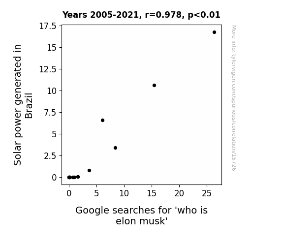 This means 95.7% of the change in the one variable (i.e., Google searches for 'who is elon musk') is predictable based on the change in the other (i.e., Solar power generated in Brazil) over the 17 years from 2005 through 2021.