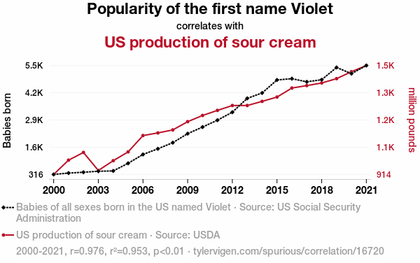 This means 95.3% of the change in the one variable (i.e., US production of sour cream) is predictable based on the change in the other (i.e., Popularity of the first name Violet) over the 22 years from 2000 through 2021.