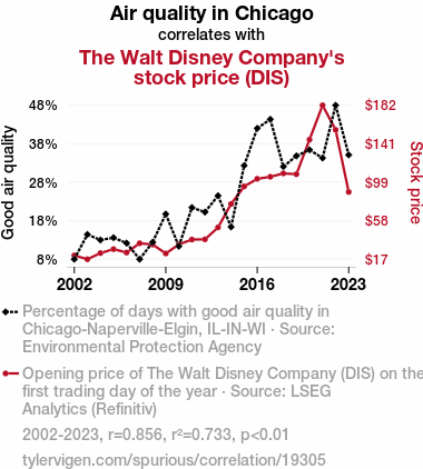 This means 73.3% of the change in the one variable (i.e., The Walt Disney Company's stock price (DIS)) is predictable based on the change in the other (i.e., Air quality in Chicago) over the 22 years from 2002 through 2023.