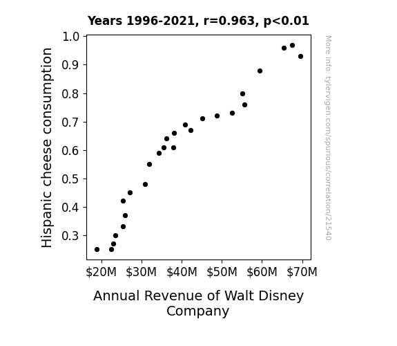 This means 92.8% of the change in the one variable (i.e., Annual Revenue of Walt Disney Company) is predictable based on the change in the other (i.e., Hispanic cheese consumption) over the 26 years from 1996 through 2021.