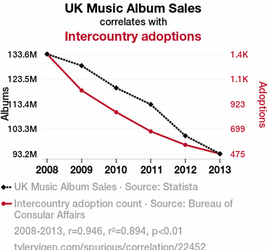 This means 89.4% of the change in the one variable (i.e., Intercountry adoptions) is predictable based on the change in the other (i.e., UK Music Album Sales) over the 6 years from 2008 through 2013.