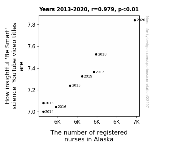 This means 95.9% of the change in the one variable (i.e., The number of registered nurses in Alaska) is predictable based on the change in the other (i.e., How insightful 'Be Smart' science YouTube video titles are) over the 8 years from 2013 through 2020.