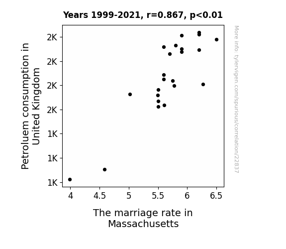This means 75.2% of the change in the one variable (i.e., The marriage rate in Massachusetts) is predictable based on the change in the other (i.e., Petroluem consumption in United Kingdom) over the 23 years from 1999 through 2021.