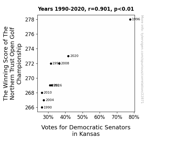 This means 81.2% of the change in the one variable (i.e., Votes for Democratic Senators in Kansas) is predictable based on the change in the other (i.e., The Winning Score of The Northern Trust Open Golf Championship) over the 9 years from 1990 through 2020.