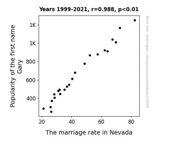 This means 97.6% of the change in the one variable (i.e., The marriage rate in Nevada) is predictable based on the change in the other (i.e., Popularity of the first name Gary) over the 23 years from 1999 through 2021.
