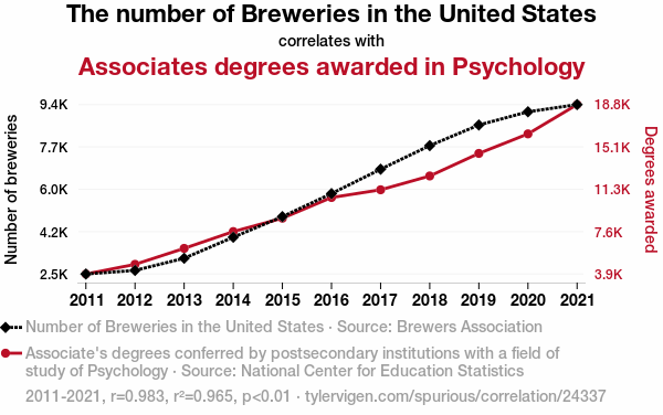 This means 96.5% of the change in the one variable (i.e., Associates degrees awarded in Psychology) is predictable based on the change in the other (i.e., The number of Breweries in the United States) over the 11 years from 2011 through 2021.