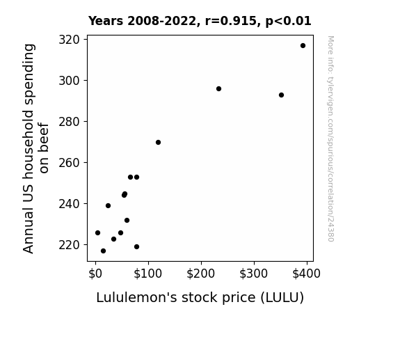 This means 83.8% of the change in the one variable (i.e., Lululemon's stock price (LULU)) is predictable based on the change in the other (i.e., Annual US household spending on beef) over the 15 years from 2008 through 2022.