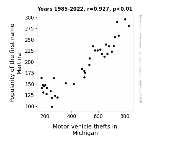 This means 85.9% of the change in the one variable (i.e., Motor vehicle thefts in Michigan) is predictable based on the change in the other (i.e., Popularity of the first name Martina) over the 38 years from 1985 through 2022.
