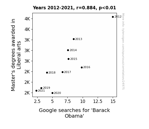 This means 78.1% of the change in the one variable (i.e., Google searches for 'Barack Obama') is predictable based on the change in the other (i.e., Master's degrees awarded in Liberal arts) over the 10 years from 2012 through 2021.