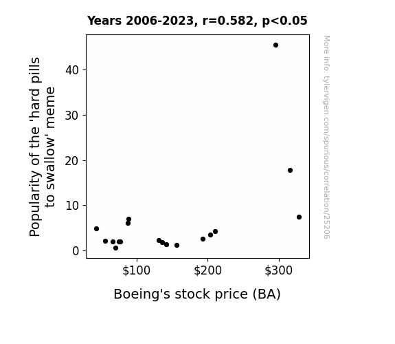 This means 33.9% of the change in the one variable (i.e., Boeing's stock price (BA)) is predictable based on the change in the other (i.e., Popularity of the 'hard pills to swallow' meme) over the 18 years from 2006 through 2023.