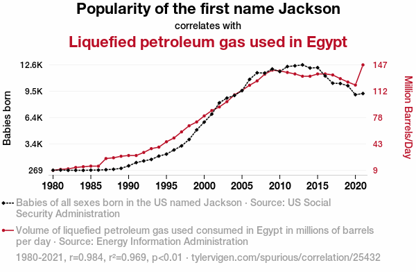 This means 96.9% of the change in the one variable (i.e., Liquefied petroleum gas used in Egypt) is predictable based on the change in the other (i.e., Popularity of the first name Jackson) over the 42 years from 1980 through 2021.