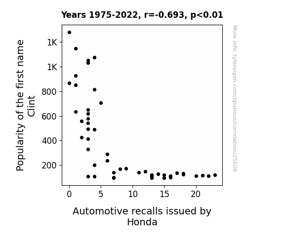 This means 48% of the change in the one variable (i.e., Automotive recalls issued by Honda) is predictable based on the change in the other (i.e., Popularity of the first name Clint) over the 48 years from 1975 through 2022.