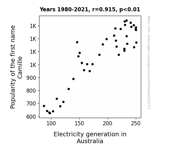 This means 83.8% of the change in the one variable (i.e., Electricity generation in Australia) is predictable based on the change in the other (i.e., Popularity of the first name Camille) over the 42 years from 1980 through 2021.