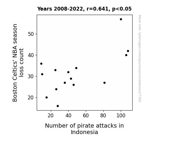 This means 41% of the change in the one variable (i.e., Number of pirate attacks in Indonesia) is predictable based on the change in the other (i.e., Boston Celtics' NBA season loss count) over the 15 years from 2008 through 2022.