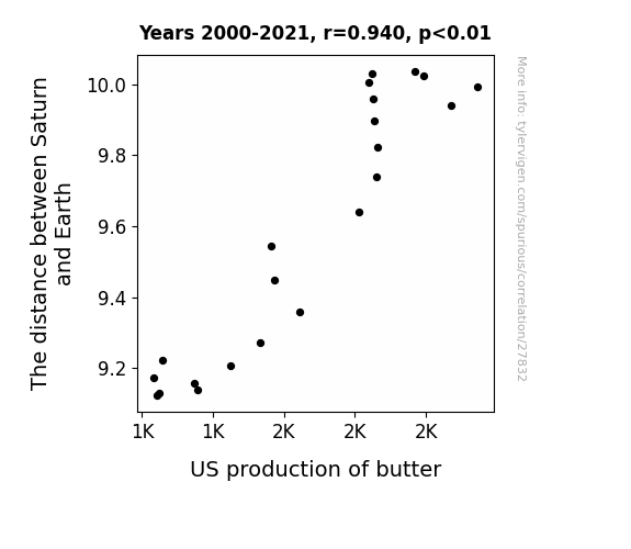 This means 88.4% of the change in the one variable (i.e., US production of butter) is predictable based on the change in the other (i.e., The distance between Saturn and Earth) over the 22 years from 2000 through 2021.