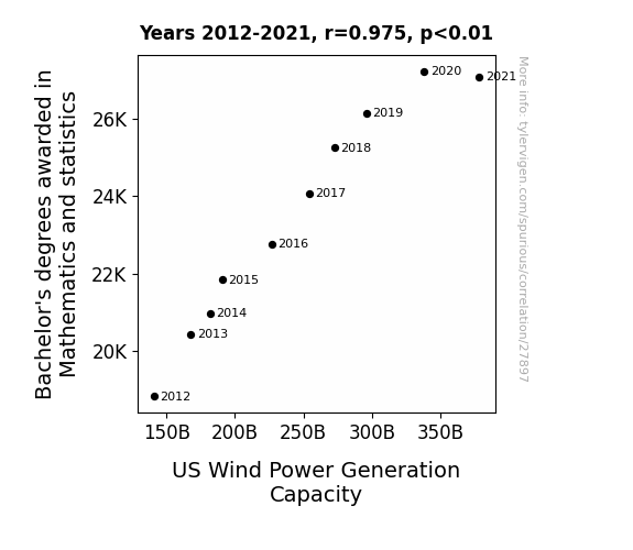 This means 95% of the change in the one variable (i.e., US Wind Power Generation Capacity) is predictable based on the change in the other (i.e., Bachelor's degrees awarded in Mathematics and statistics) over the 10 years from 2012 through 2021.
