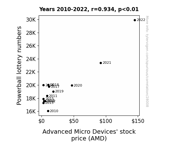 This means 87.2% of the change in the one variable (i.e., Advanced Micro Devices' stock price (AMD)) is predictable based on the change in the other (i.e., Powerball lottery numbers) over the 13 years from 2010 through 2022.