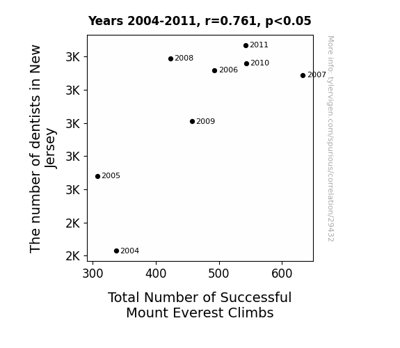 This means 58% of the change in the one variable (i.e., Total Number of Successful Mount Everest Climbs) is predictable based on the change in the other (i.e., The number of dentists in New Jersey) over the 8 years from 2004 through 2011.