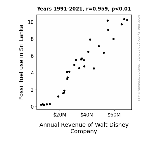 This means 92.1% of the change in the one variable (i.e., Annual Revenue of Walt Disney Company) is predictable based on the change in the other (i.e., Fossil fuel use in Sri Lanka) over the 31 years from 1991 through 2021.