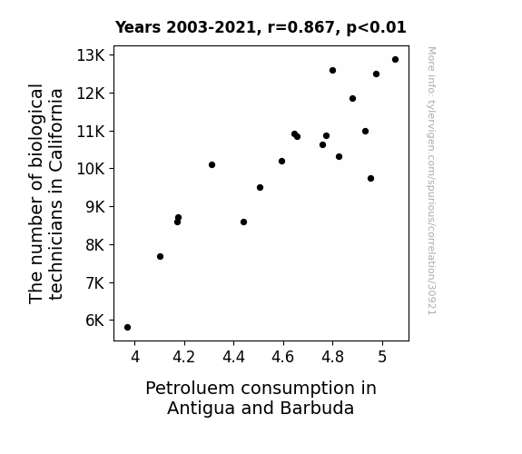 This means 75.1% of the change in the one variable (i.e., Petroluem consumption in Antigua and Barbuda) is predictable based on the change in the other (i.e., The number of biological technicians in California) over the 19 years from 2003 through 2021.