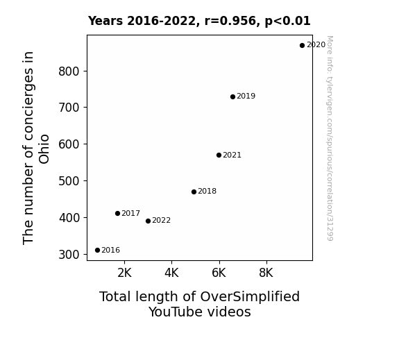 This means 91.3% of the change in the one variable (i.e., Total length of OverSimplified YouTube videos) is predictable based on the change in the other (i.e., The number of concierges in Ohio) over the 7 years from 2016 through 2022.