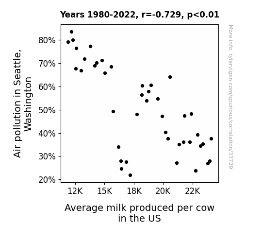 This means 53.1% of the change in the one variable (i.e., Average milk produced per cow in the US) is predictable based on the change in the other (i.e., Air pollution in Seattle, Washington) over the 43 years from 1980 through 2022.
