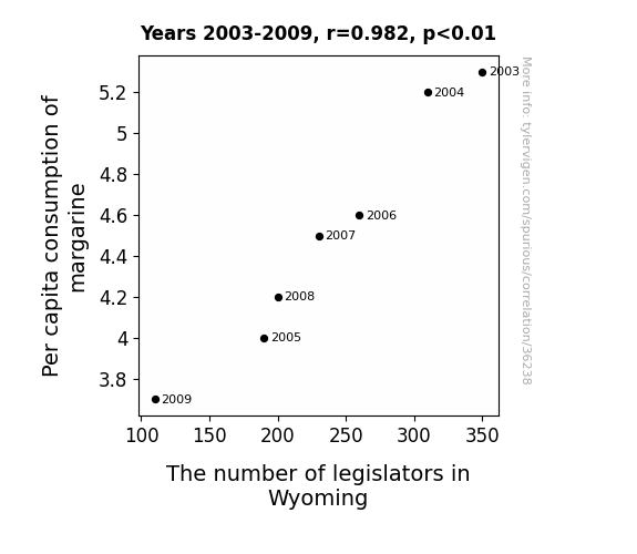 This means 96.4% of the change in the one variable (i.e., The number of legislators in Wyoming) is predictable based on the change in the other (i.e., Per capita consumption of margarine) over the 7 years from 2003 through 2009.