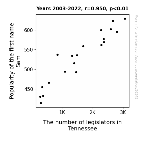 This means 90.3% of the change in the one variable (i.e., The number of legislators in Tennessee) is predictable based on the change in the other (i.e., Popularity of the first name Sam) over the 20 years from 2003 through 2022.