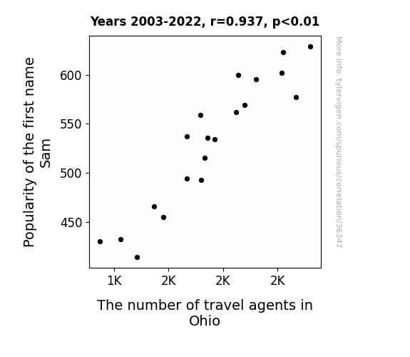 This means 87.9% of the change in the one variable (i.e., The number of travel agents in Ohio) is predictable based on the change in the other (i.e., Popularity of the first name Sam) over the 20 years from 2003 through 2022.