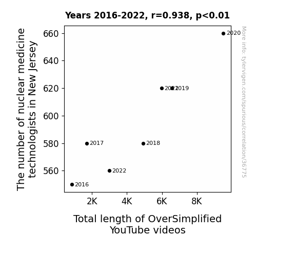 This means 88% of the change in the one variable (i.e., Total length of OverSimplified YouTube videos) is predictable based on the change in the other (i.e., The number of nuclear medicine technologists in New Jersey) over the 7 years from 2016 through 2022.