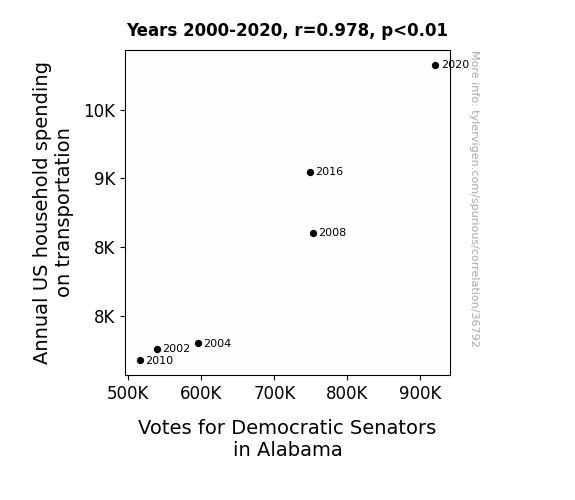 This means 95.6% of the change in the one variable (i.e., Votes for Democratic Senators in Alabama) is predictable based on the change in the other (i.e., Annual US household spending on transportation) over the 6 years from 2000 through 2020.