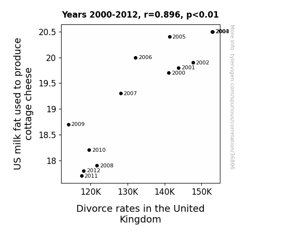 This means 80.3% of the change in the one variable (i.e., Divorce rates in the United Kingdom) is predictable based on the change in the other (i.e., US milk fat used to produce cottage cheese) over the 13 years from 2000 through 2012.