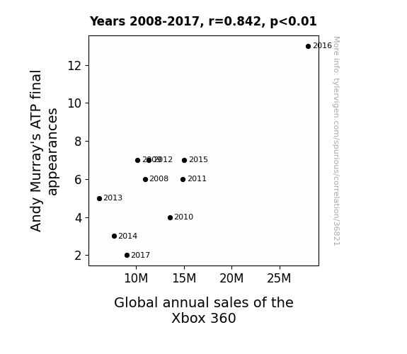 This means 70.8% of the change in the one variable (i.e., Global annual sales of the Xbox 360) is predictable based on the change in the other (i.e., Andy Murray's ATP final appearances) over the 10 years from 2008 through 2017.