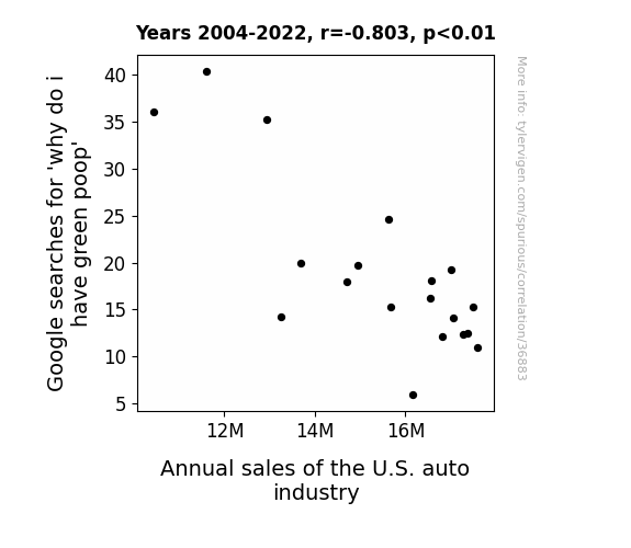 This means 64.5% of the change in the one variable (i.e., Annual sales of the U.S. auto industry) is predictable based on the change in the other (i.e., Google searches for 'why do i have green poop') over the 19 years from 2004 through 2022.