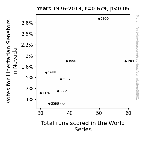 This means 46.1% of the change in the one variable (i.e., Total runs scored in the World Series) is predictable based on the change in the other (i.e., Votes for Libertarian Senators in Nevada) over the 9 years from 1976 through 2013.