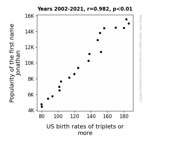 This means 96.4% of the change in the one variable (i.e., US birth rates of triplets or more) is predictable based on the change in the other (i.e., Popularity of the first name Jonathan) over the 20 years from 2002 through 2021.