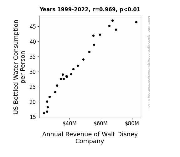 This means 93.9% of the change in the one variable (i.e., Annual Revenue of Walt Disney Company) is predictable based on the change in the other (i.e., US Bottled Water Consumption per Person) over the 24 years from 1999 through 2022.