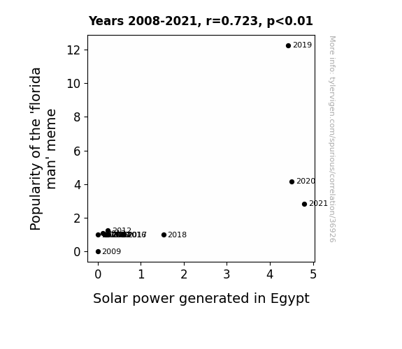 This means 52.3% of the change in the one variable (i.e., Solar power generated in Egypt) is predictable based on the change in the other (i.e., Popularity of the 'florida man' meme) over the 14 years from 2008 through 2021.