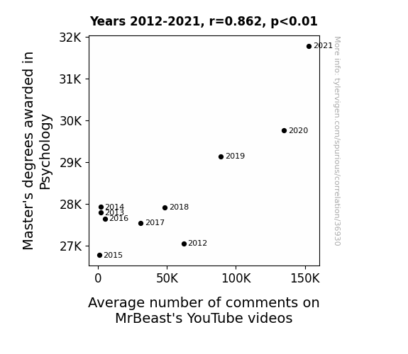This means 74.3% of the change in the one variable (i.e., Average number of comments on MrBeast's YouTube videos) is predictable based on the change in the other (i.e., Master's degrees awarded in Psychology) over the 10 years from 2012 through 2021.