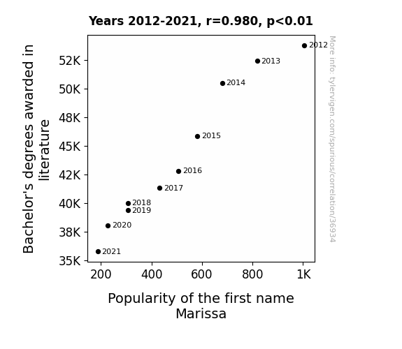 This means 96% of the change in the one variable (i.e., Popularity of the first name Marissa) is predictable based on the change in the other (i.e., Bachelor's degrees awarded in literature) over the 10 years from 2012 through 2021.