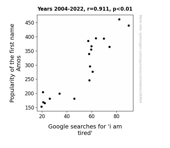 This means 83% of the change in the one variable (i.e., Google searches for 'i am tired') is predictable based on the change in the other (i.e., Popularity of the first name Amos) over the 19 years from 2004 through 2022.